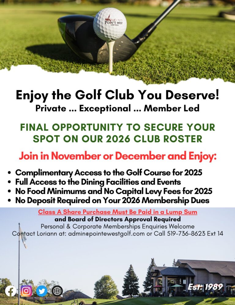 For additional information on any of the above Membership Categories, please contact Loriann in Membership Sales & Services at 519-736-8623 Ext 14 or by email to admin@pointewestgolf.com.